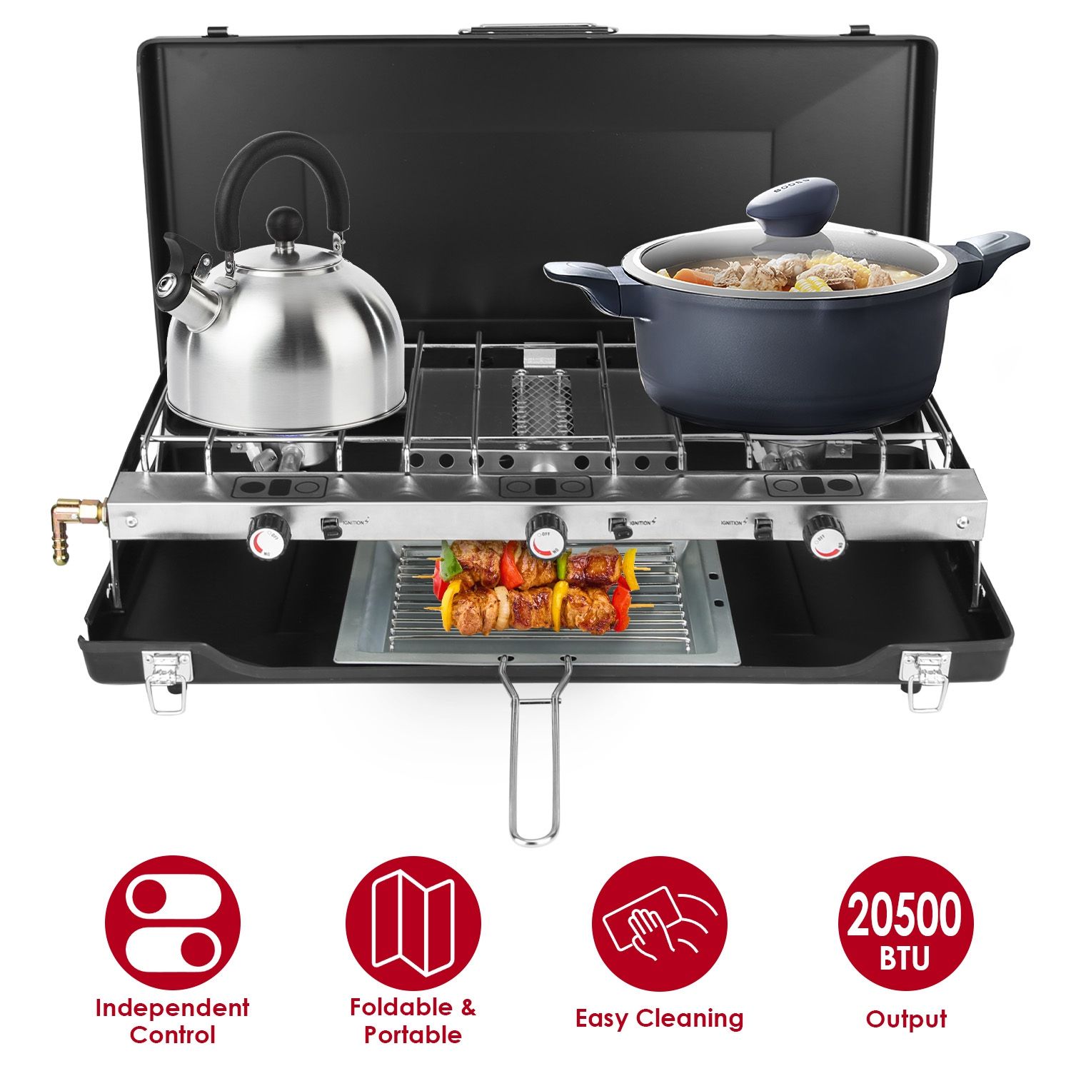 *3 Burners with Independent Control*:Our portable gas camping stove features with 3 burners,each can be independently adjusted and simultaneously working,allowing you to customize the heat settings for different cooking needs. The two side burners provide 6600 BTUs of heating power,which is ideal for boiling water in teapots or simmering soups in pots. The middle burner with 7200 BTUs high power is designed for grilling and barbecuing.