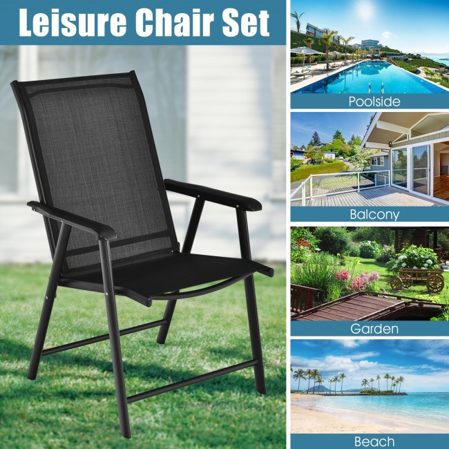 High quality and brand new4 pieces folding textilene chairs with armrestSteel frame; sturdy and durableFolding feature; easy and simple to store or transportPerfect for family gathering; party and outdoor campingNo assembly need