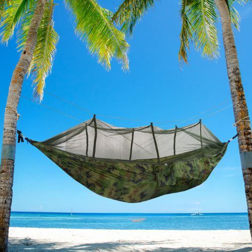 Seamless Outdoor Sleeping Hammock With Mosquito NetHammock Material: 210D nylon fabric (Parachute cloth)Mesh Material: High-Density NetSpecifications:  102in × 55.18inNet Weight: (1.43lb)Maximum Support Weight: 660lbs (300kg)Accessories:2m strap × 24m draw rope × 2Color Options: 14 colors availableApplicable Scenarios: Picnics, outings, camping, etc.Features:High-Quality Mesh Protection: High-density mesh prevents mosquitoes from entering, ensuring a comfortable and breathable outdoor experience.Easy Setup: Simple strap and rope installation allows for quick setup between trees.Lightweight & Portable: Weighing only 650g (1.4lb), it’s easy to carry for camping, hiking, and beach trips without adding bulk.Adjustable Strap System: Standard 2m strap allows for flexible tree distance adjustments, enhancing convenience.User-Friendly Installation: Mosquito net design enables hassle-free setup—just wrap the straps around trees, tighten, and enjoy.