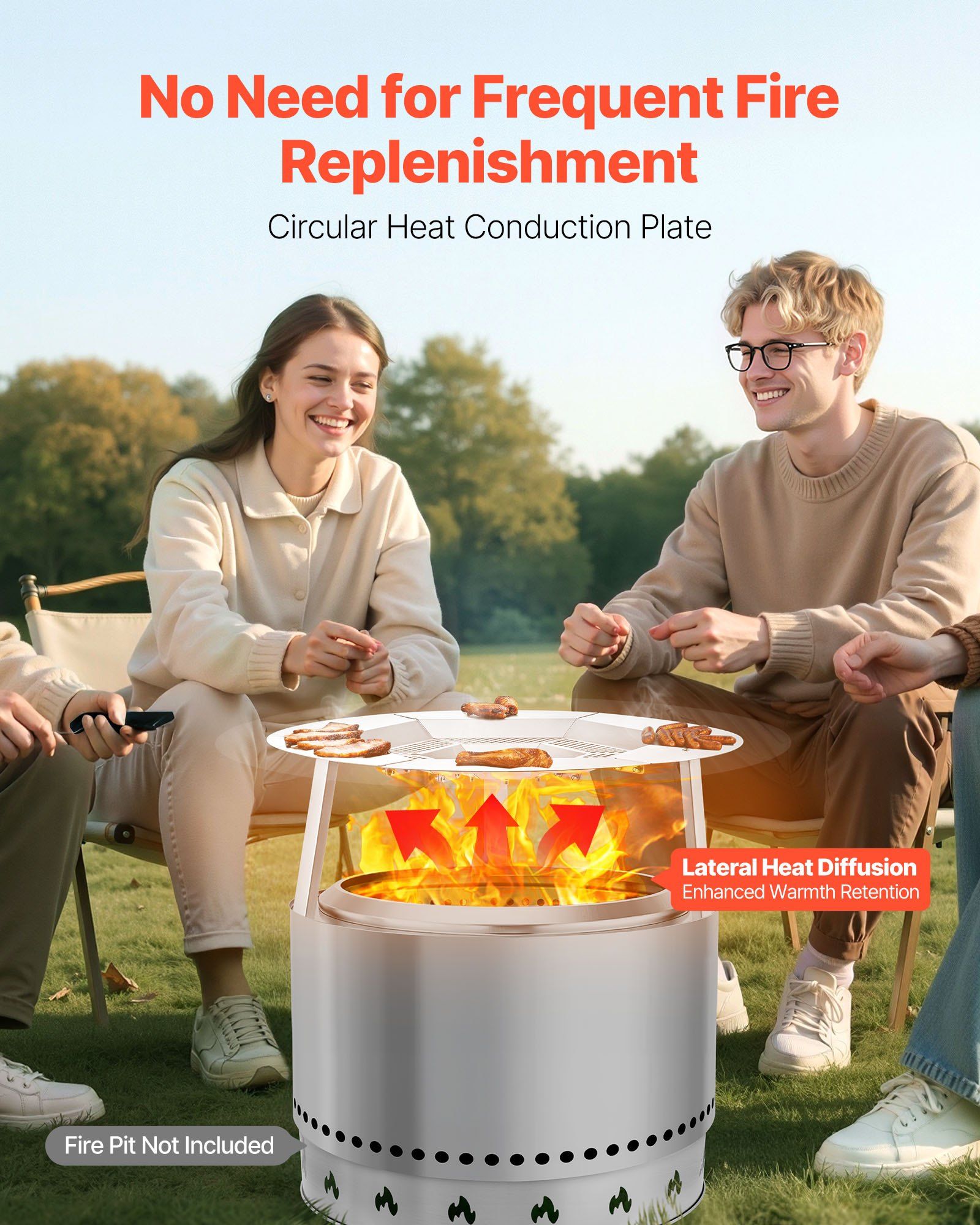 The fire pit heat shield features a stainless steel top, heat-resistant and spark-proof. It holds grill nets or foil trays for roasting marshmallows, sweet potatoes, or small meats. Even heat distribution and sturdy legs ensure reliable use for outdoor cooking fun.