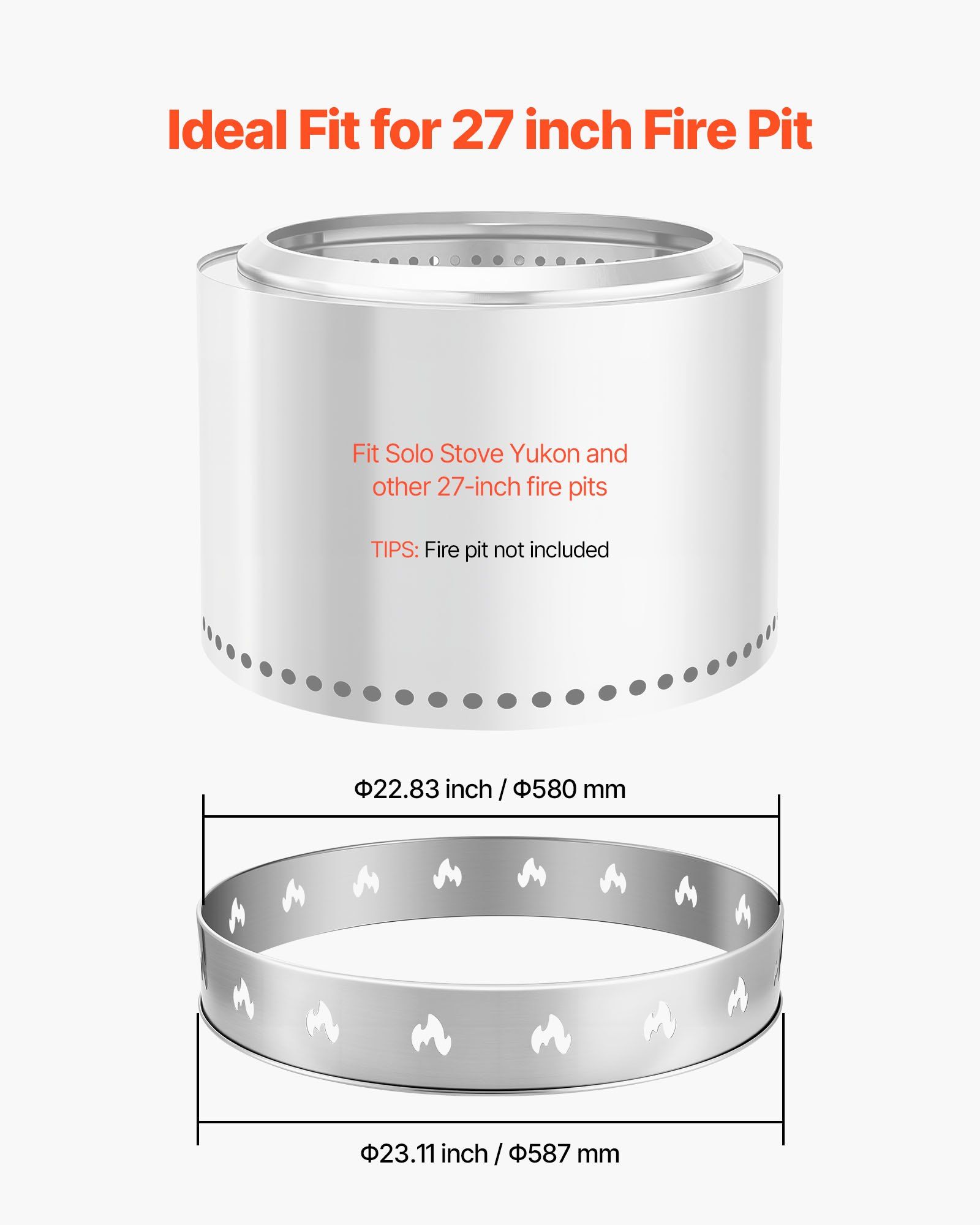 1.Precise Fit: Designed for Solo Stove 27-inch / 68.6 cm Bonfire. The stove bonfire base stand fits precisely with a top diameter of Φ22.83 inch / Φ579.88 mm and bottom Φ23.11 inch / Φ586.99 mm. It offers stable support, compatible with popular brands for a seamless outdoor experience