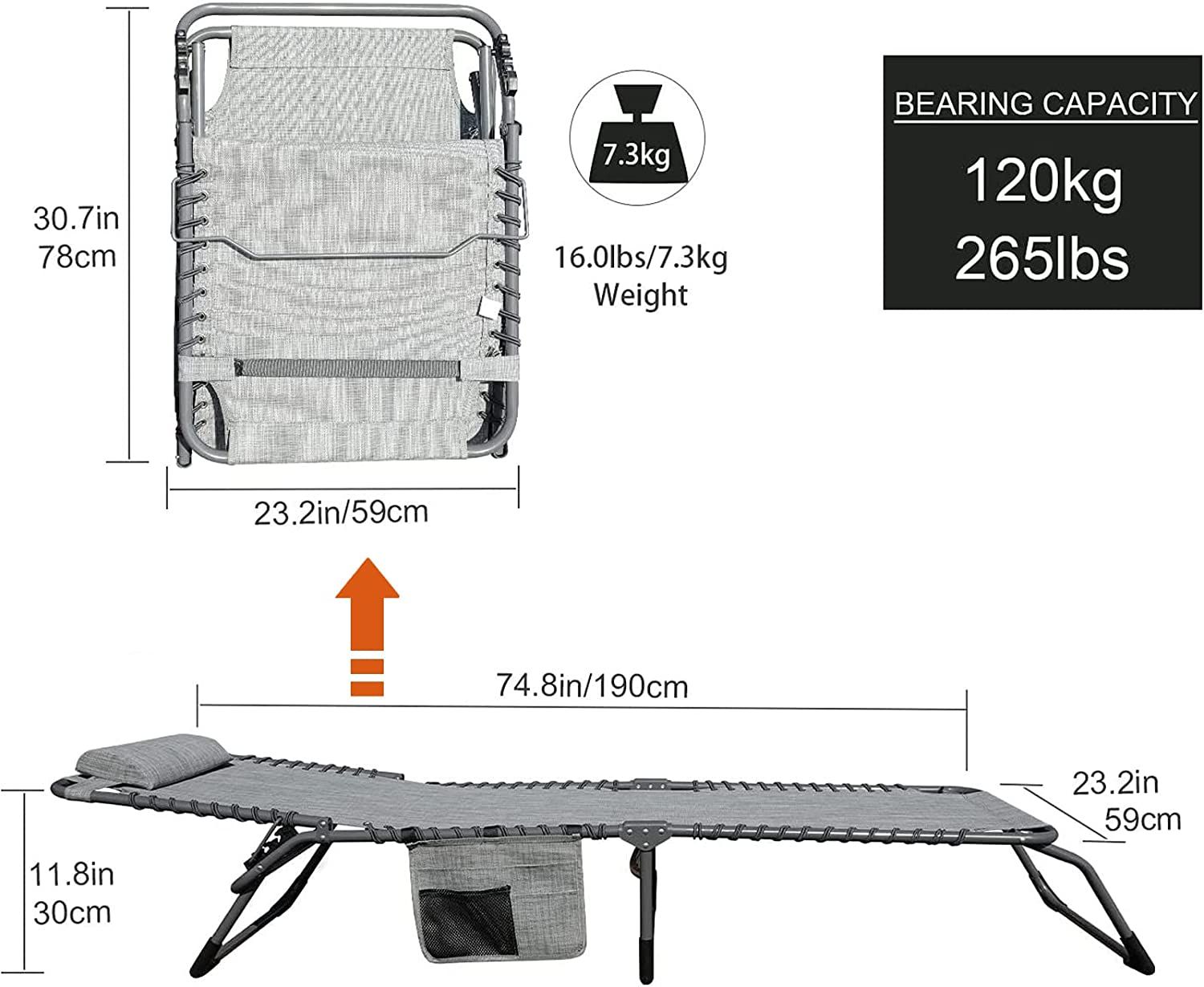 5.Easy Storage and Carrying: Our chaise lounge chair possesses a quick folding design,No Assembly Required, which is convenient to carry and store. You can easily put it into the trunk of the car or carry it directly by hand.