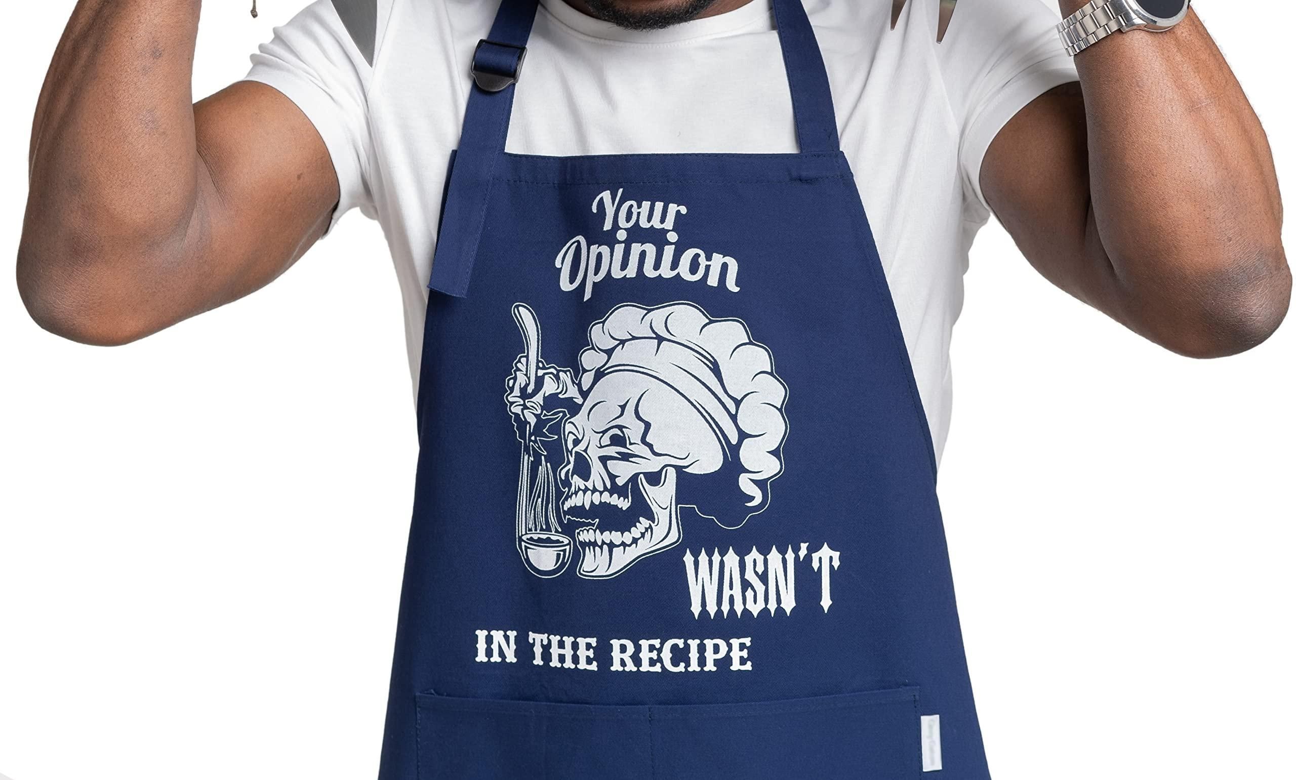 2.function and comfort - your opinion wasn't in the recipe apron has adjustable neck and waist straps, which makes it universal for any size and suits both men and women. funny mens apron comes with 2 large pockets, which are convenient for carrying kitchen utensils while baking a pie or barbequing.