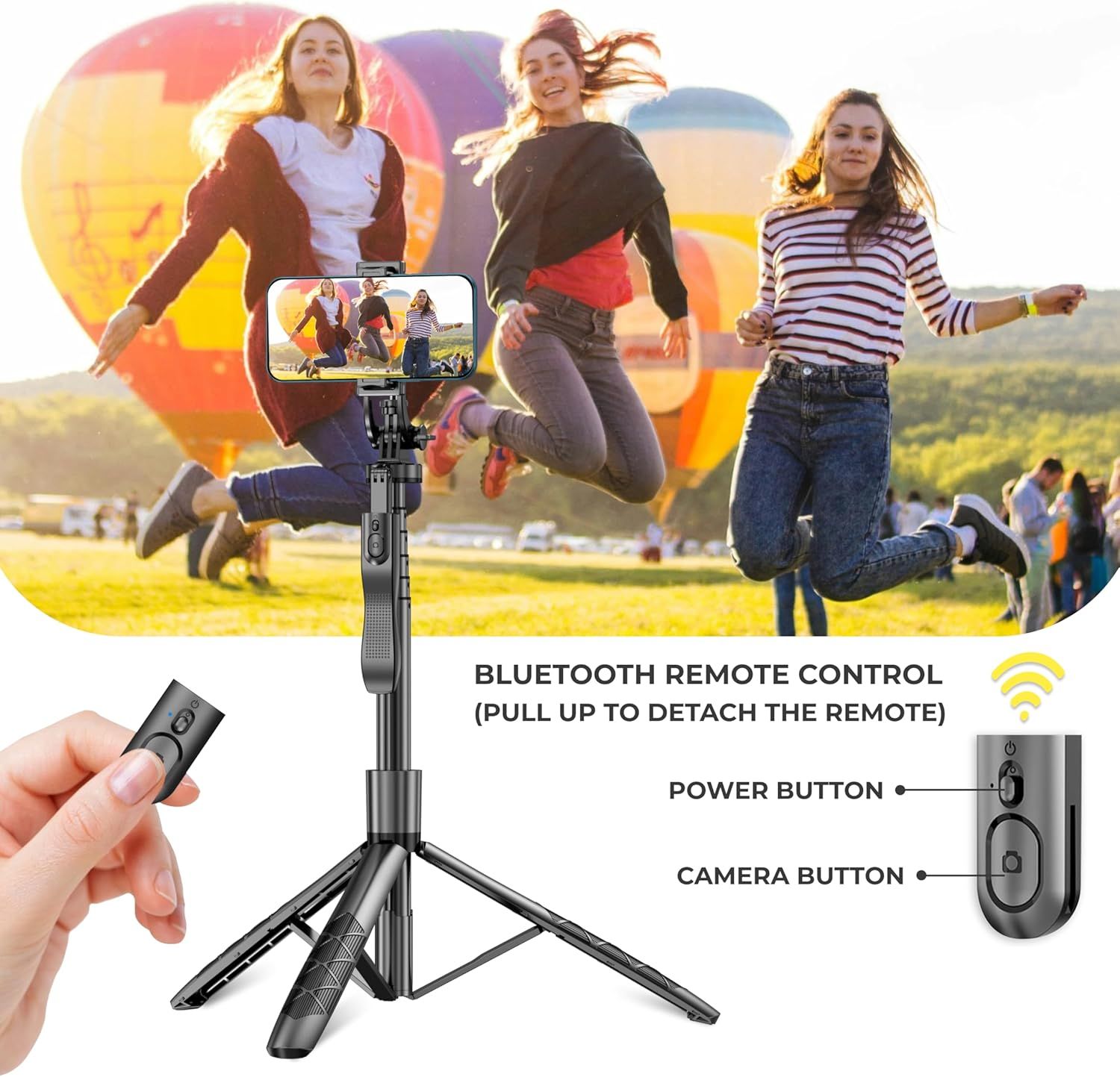 5.Bluetooth Remote & UNIVERSAL CELL PHONE TRIPOD: remote controlled selfie stand works 30 feet away. Works with iPhone, Android, most camera brands & cell phones. Fit for gym, travel, content creating. Pull up to detach the remote.